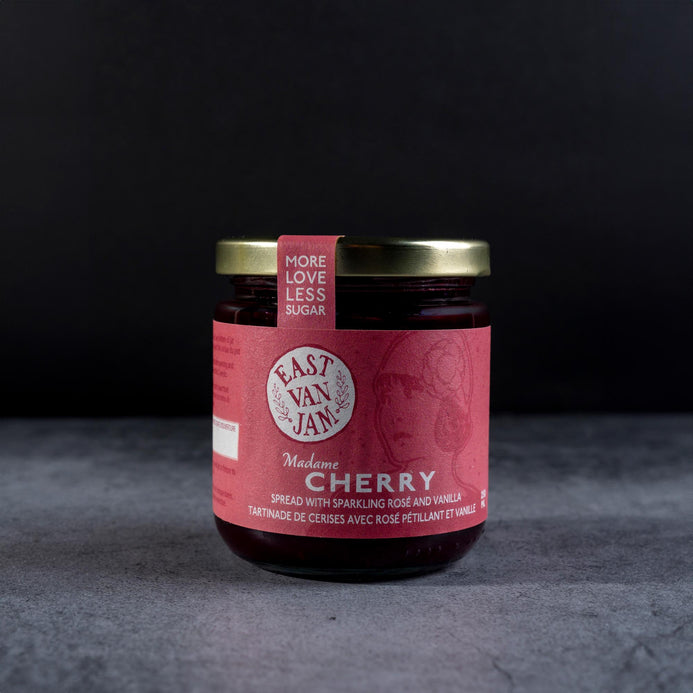 Dark sweet ripe Okanagan cherries, is perfectly completed by a splash of rosé wine and the warm essence of vanilla. This jam is perfection when served with burrata and a crusty baguette.
