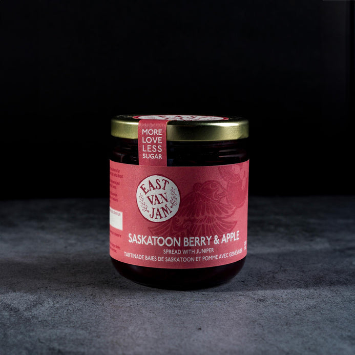 Adding juniper berries brings a subtle piney, citrusy note that complements the sweetness of the Saskatoon berries beautifully. This unique jam is perfect for spreading on toast, pairing with cheese or using as a topping on desserts.